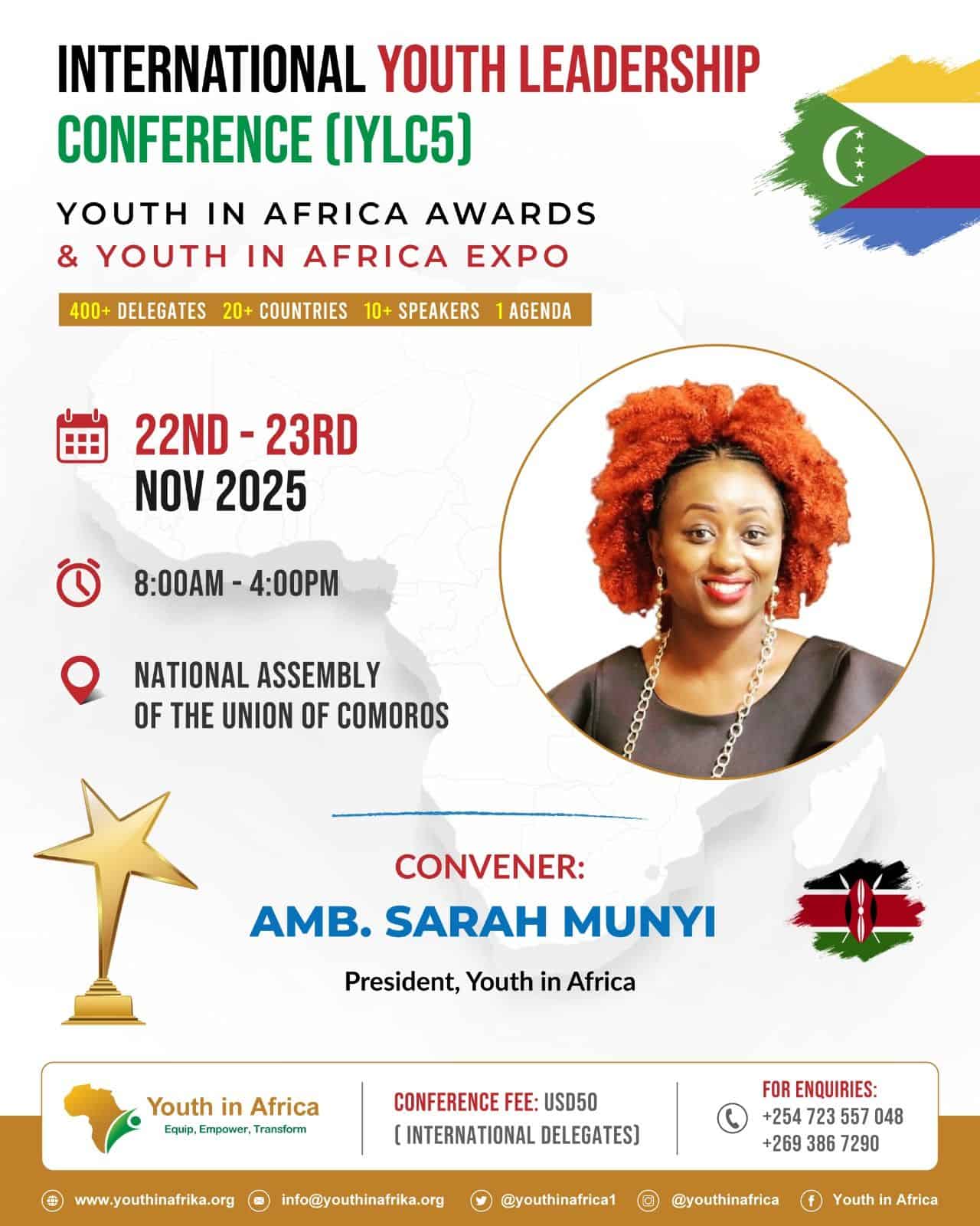 Convened by Ambassador Sarah Munyi, President of Youth in Africa, the conference emphasizes themes of leadership training and entrepreneurship, directly resonating with our organization’s priorities. The program runs daily from 8:00 AM to 4:00 PM, offering a platform for meaningful dialogue, networking, and recognition of outstanding youth contributions through the awards segment. For international delegates, a conference fee of USD 50 applies, with further details available via the organization’s website at www.youthinafrica.org or through their contact lines (+254 723 557 048 or +269 386 7290).
